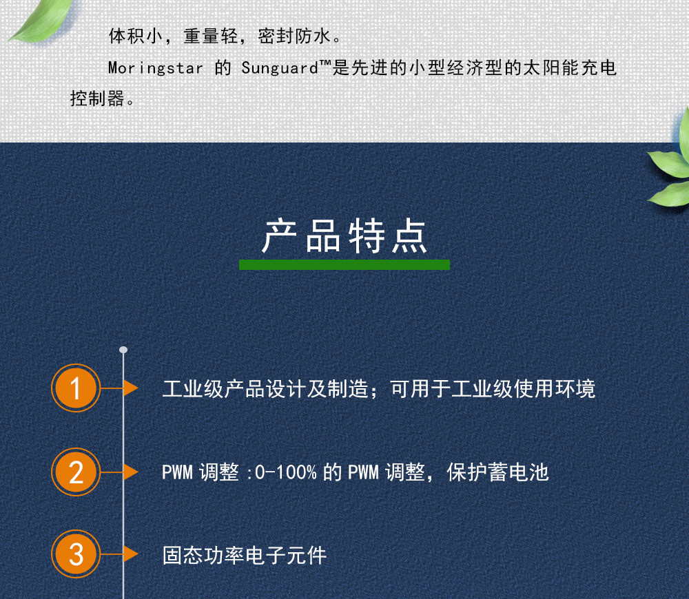 體積小,重量輕,密封防水。Moringstar的Sunguard?是小型經(jīng)濟(jì)型的太陽能充電控制器。