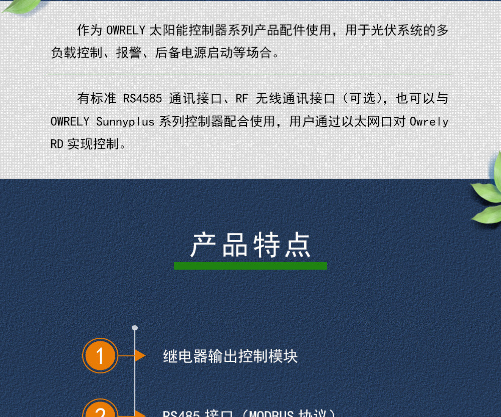 ?作為OWRELY太陽能控制器系列產(chǎn)品配件使用,用于光伏系統(tǒng)的多負(fù)載控制、報警、后備電源啟動等場合。有標(biāo)準(zhǔn)RS4585通訊接口、RF無線通訊接口(可選),也可以與OWRELY Sunnyplus系列控制器配合使用,用戶通過以太網(wǎng)口對Owrely RD實現(xiàn)控制。